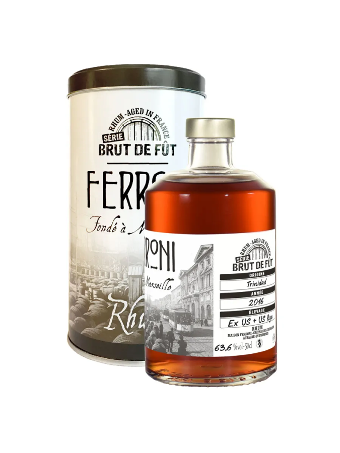 FERRONI Trinidad 2016 est un rhum de mélasse provenant de Trinidad et embouteillé brut de fût à 63.6%. Sélectionné par Guillaume Ferroni, ce rhum a vieilli pendant trois années en fût américain puis quatre années supplémentaires en dans le sud de la France en fût américain Ex-Rye whisky (Roof Rye produit par la Maison Ferroni). Le premier élevage est tropical : chaud, humide, sans grandes variations de températures. Le deuxième élevage est méditerranéen : étés très chauds (encore plus qu’aux Caraïbes) et secs, hivers froids. Les amplitudes thermiques sont importantes. Cet élevage accélère la maturation des rhums de manière aussi importante que le tropical, avec une part des anges souvent supérieure. Le nez est vanillé avec de belles notes torréfiées. L’attaque en bouche est douce. Un rhum marqué par le chêne américain qui évoque le dessert : notes de vanille, flanc au caramel. Une finale qui évolue sur des arômes torréfiés, café, biscotte, chêne roussi. Il fait partie de la série brut de fûts 2023 de Guillaume Ferroni.