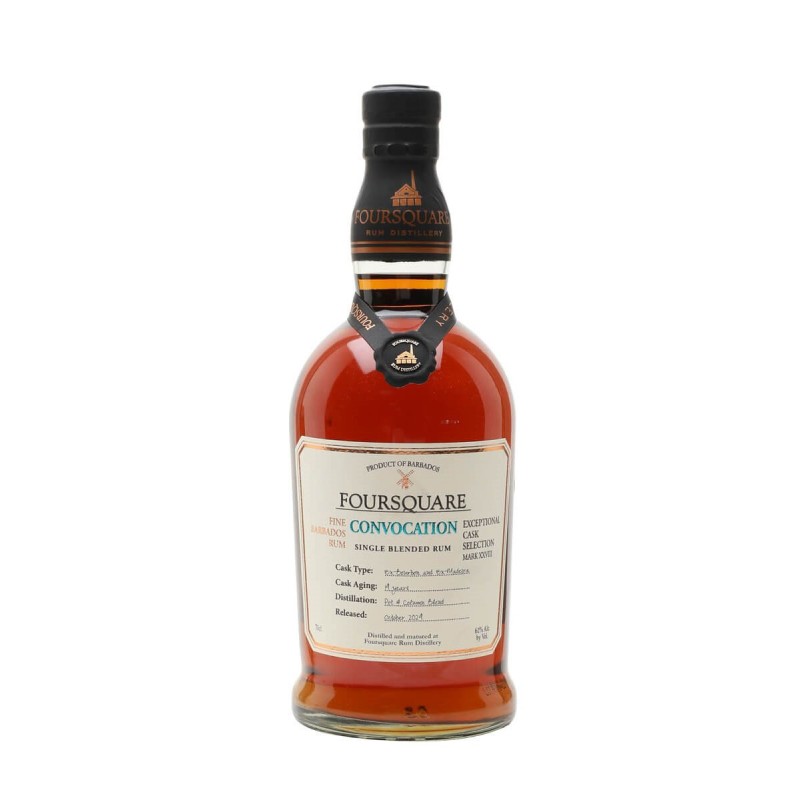 FOURSQUARE Rum 14 Ans Convocation 62% est un excellent rhum vieux issu de la prestigieuse gamme Exceptional Cask Selection. Foursquare Convocation 14 ans est un rhum de mélasse de la Barbade embouteillé à son degré naturel, sans ajout ni filtration à froid, fidèle à la philosophie artisanale de la distillerie Foursquare. Cette cuvée puissante et racée repose sur l’assemblage de trois rhums distillés en alambic pot still et en colonne : un rhum de 14 ans vieilli en fûts ex-bourbon, un second de 14 ans élevé en fûts ex-Madeira, et un troisième ayant bénéficié d’un double vieillissement (4 ans en ex-bourbon puis 10 ans en ex-Madeira). Cette construction précise donne naissance à un rhum sec, intense et structuré, où la richesse du bois rencontre une profondeur fruitée et oxydative remarquable. À 62 %, Foursquare Convocation s’adresse clairement aux amateurs de grands rhums de dégustation, recherchant puissance maîtrisée, complexité aromatique et expression pure du terroir barbadien, dans un style droit, sans concession et résolument gastronomique.