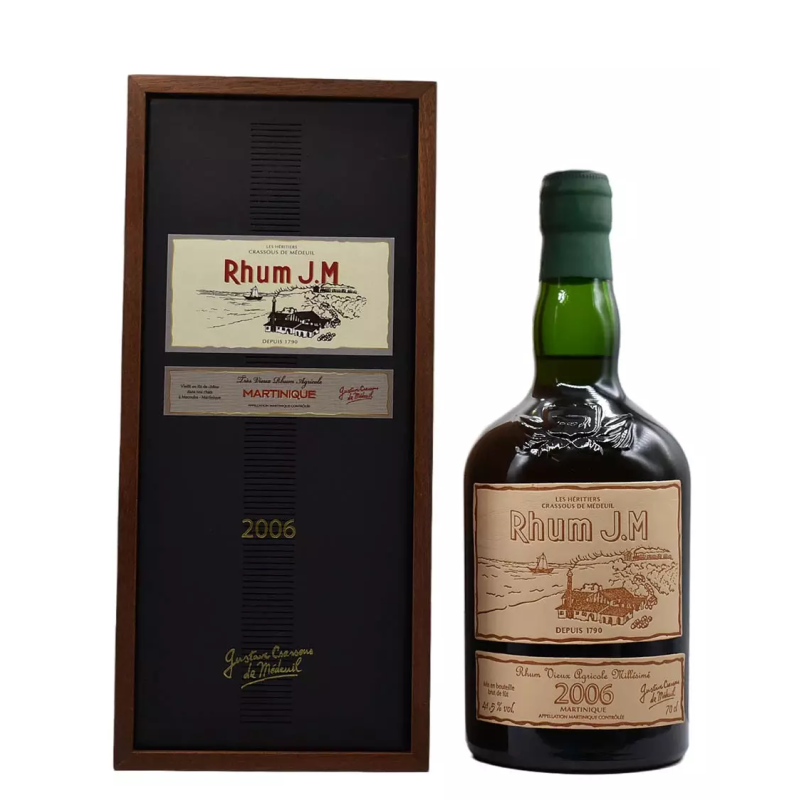 J.M Millésime 2009 est un rhum agricole d'exception vieilli pendant 15 ans en fûts ex bourbon et embouteillé délicatement "brut de fût" afin de préserver l'équilibre aromatique. Après un long vieillissement près de 70% du volume initial des fûts s'évapore, il s'agit un rhum très rare et somptueux. Il est présenté dans un joli coffret bois et la bouteille est ornée d’une élégante étiquette en cuir. Edition très limitée. La photo représente l'ancienne édition mais même packaging pour le 2009.